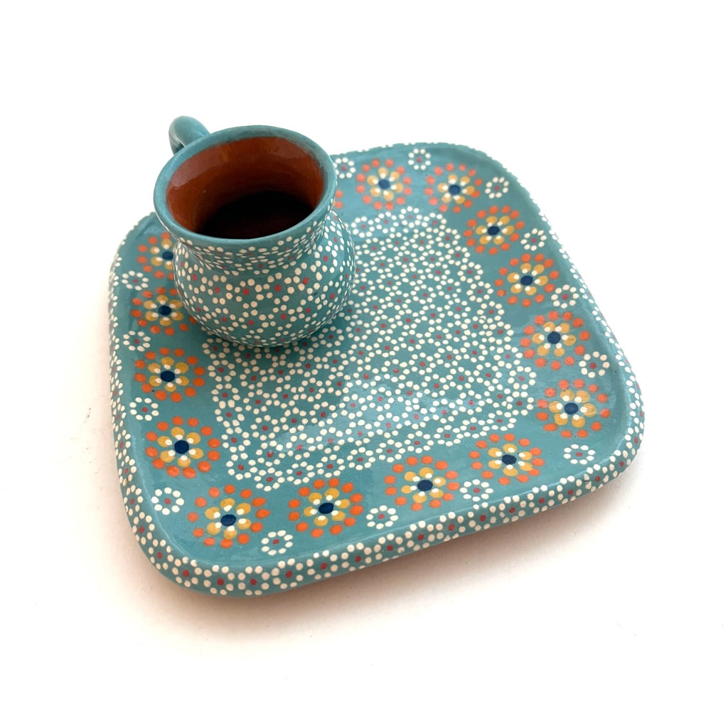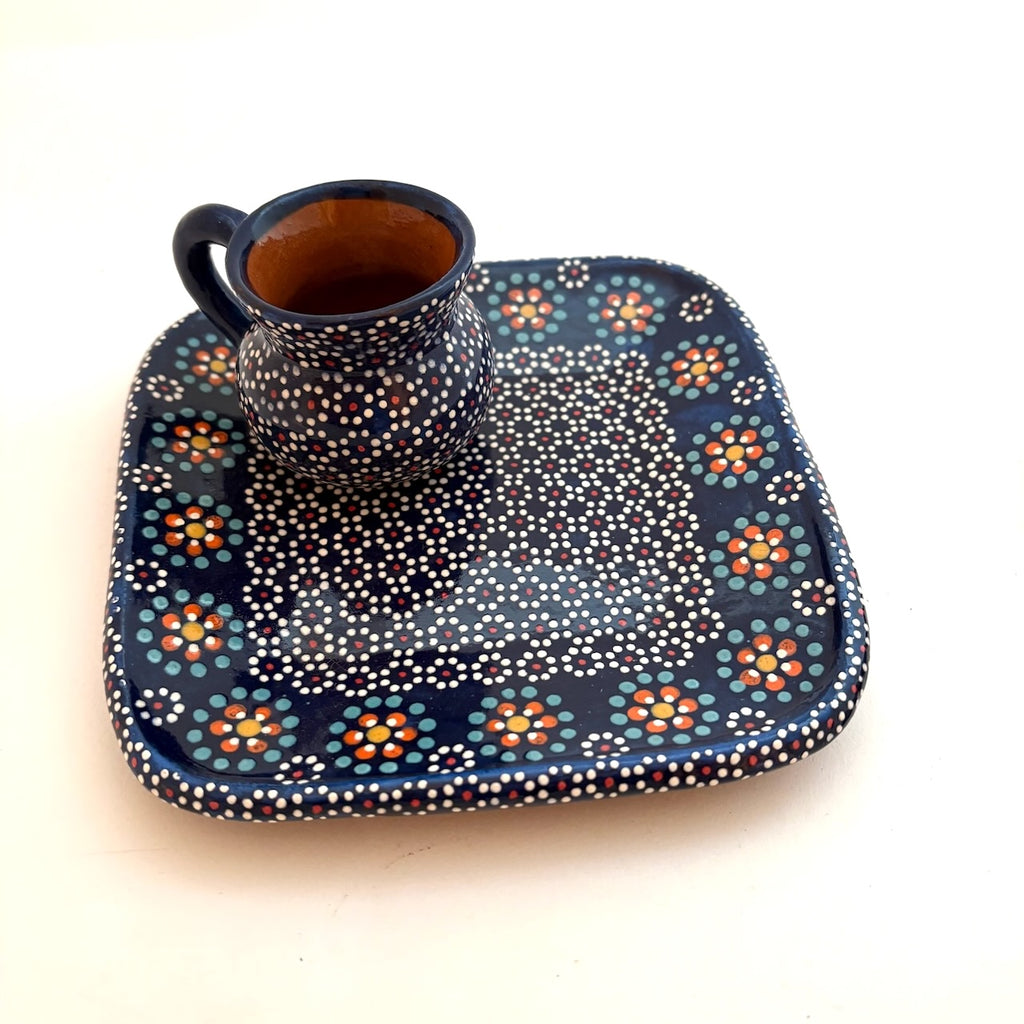 When we've enjoyed a copita of mezcal in Michoacán, sometimes it's often accompanied by cut up fruit and special salts--served on a handmade ceramic plate. We love that idea and decided to put together these pieces that are not only practical, but beautiful! These very popular cups from Capula match nicely with the square platitos and you can mix and match if you like. If you want to purchase several--please contact us and we'll combine shipping charges.